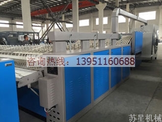 蘇星燃氣(天然氣,液化石油氣)直燃式節能環保型燙平機,無須鍋爐,耗能量是通用燙平機的三分之一。當布草含水率≤61%,熨燙速度為25-30米時,三滾燃氣消耗量僅4.62Kg/h,平均到每滾只有1.54Kg/h.